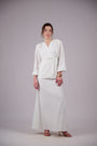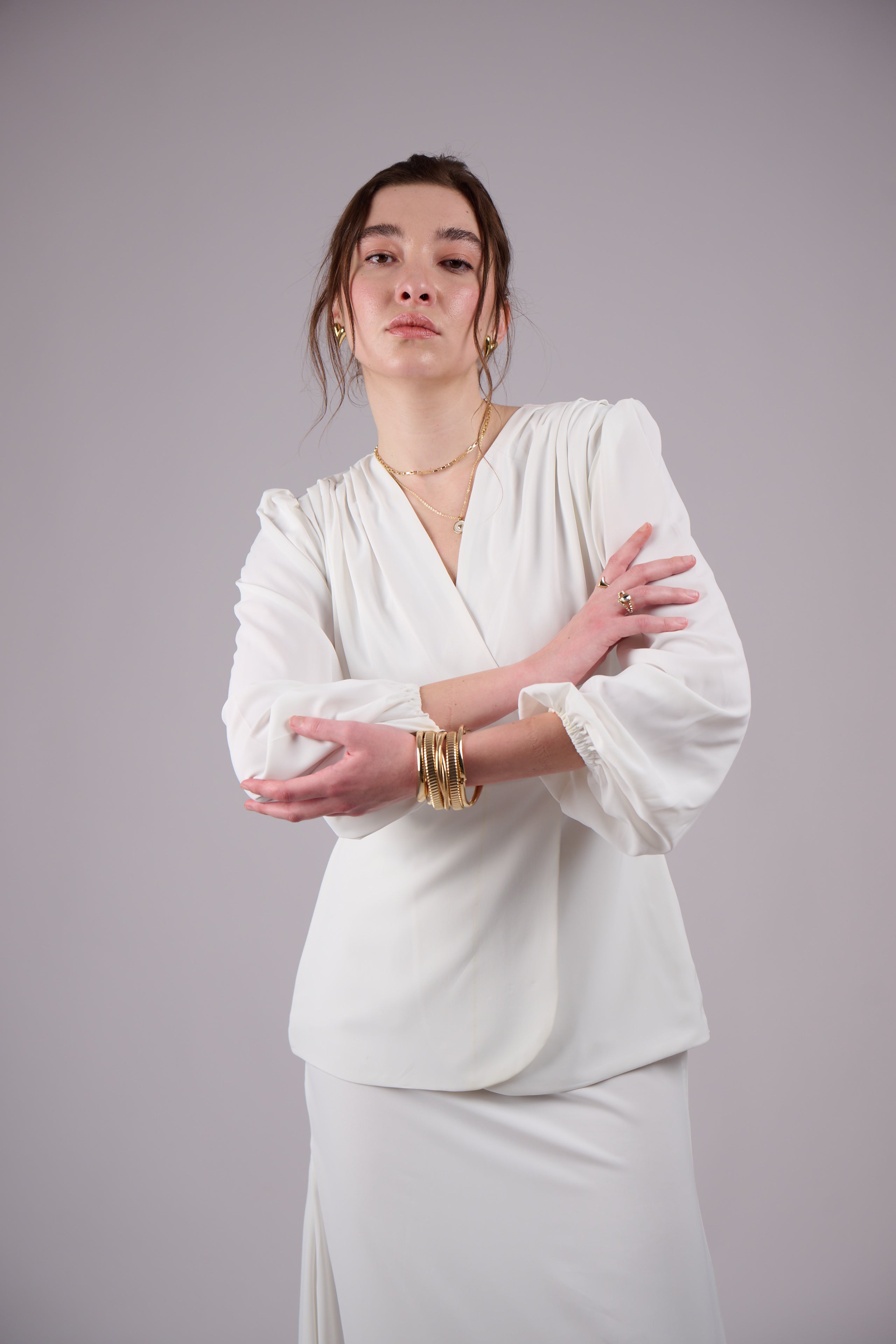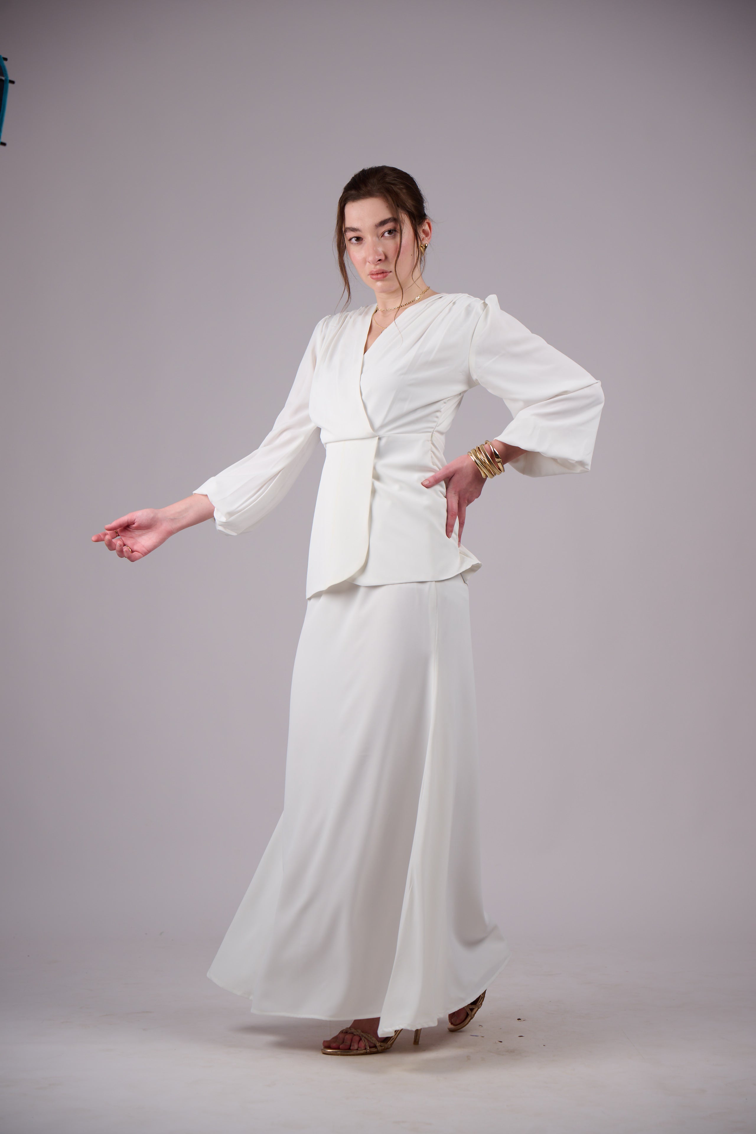 Elegant co-ord set featuring a wrap-style top with soft sleeves