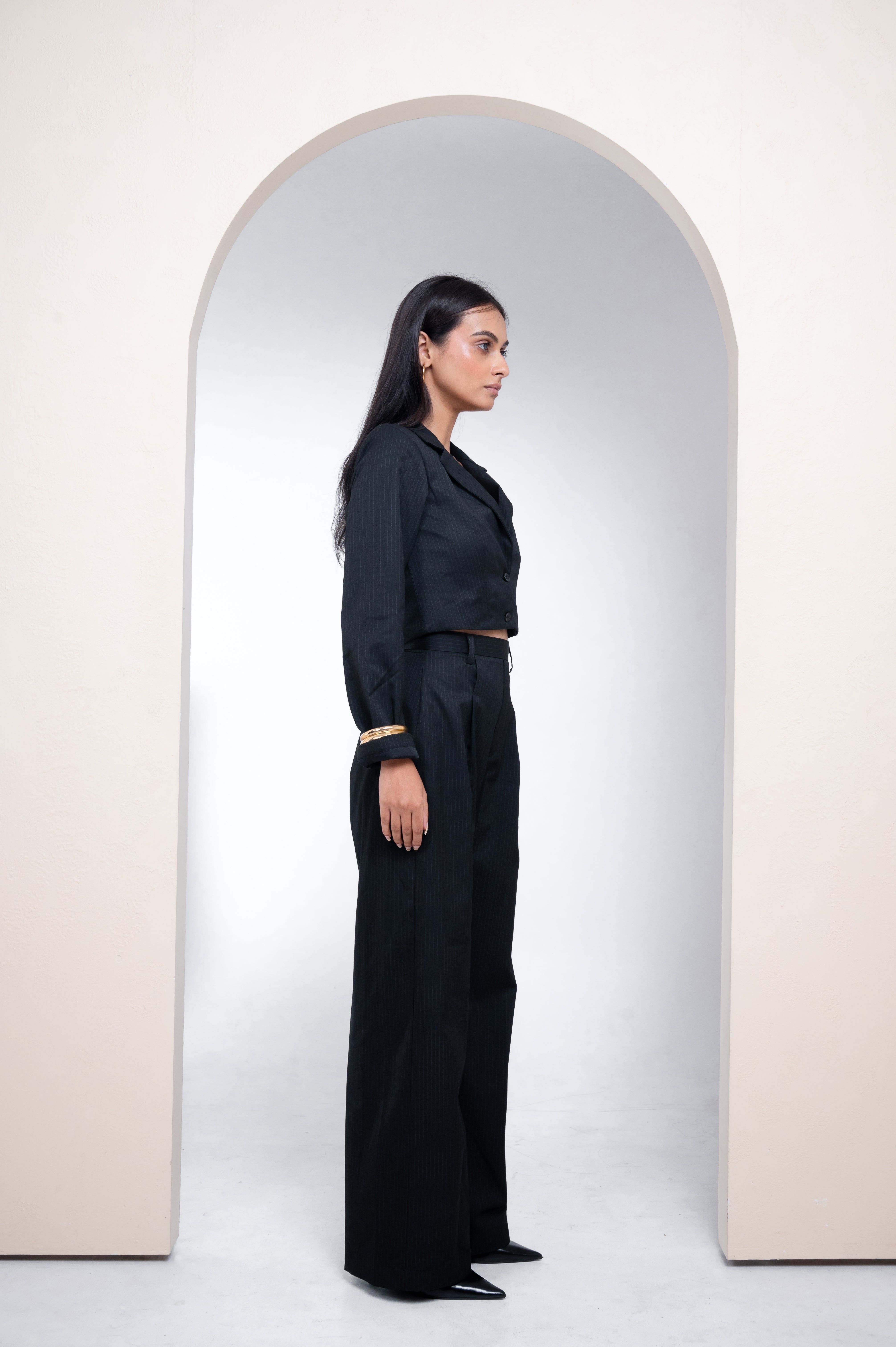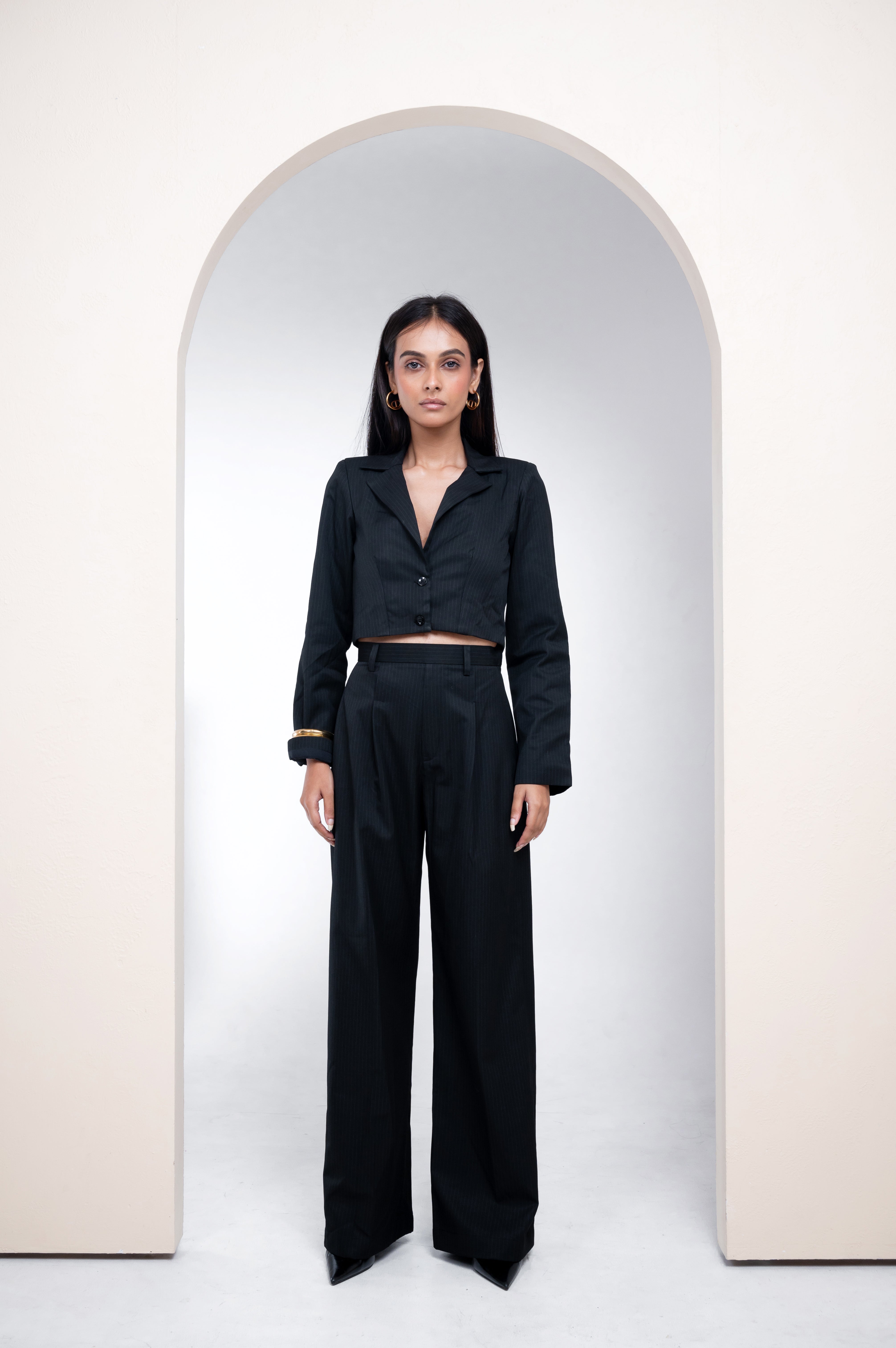 Tailored co-ord set featuring a cropped button-front blazer top