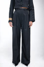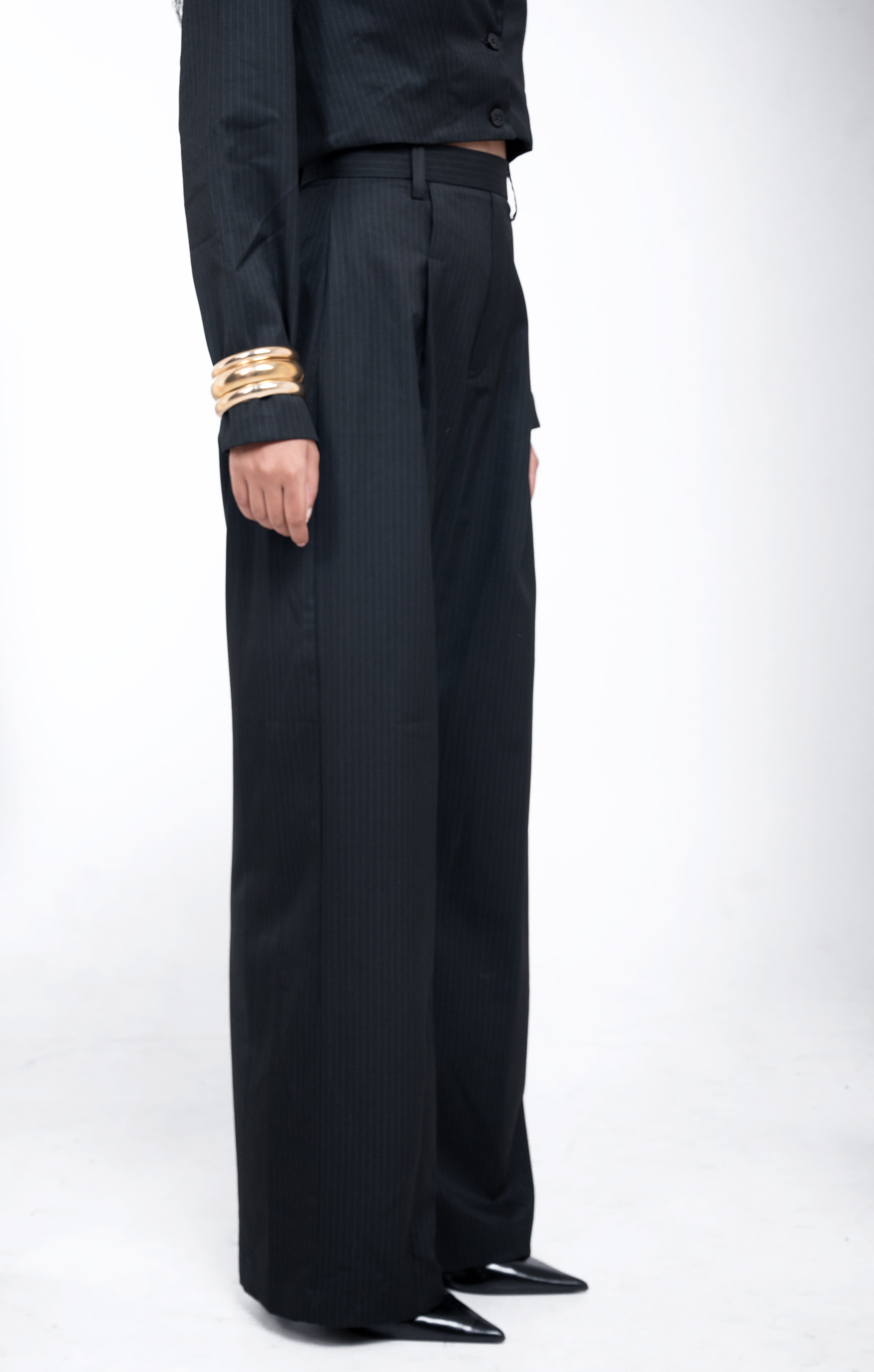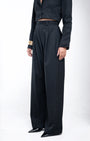 High-waisted tailored wide-leg trousers with front pleats, a structured waistband, and an elongated silhouette.